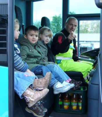 Hehner Kindergartenkinder fahren auf dem Müllwagen mit.