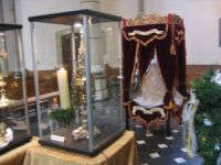 Einige Gegenstände sind so wertvoll, dass sie durch einen Glaskasten gesichert wurden, zum Beispiel eine Monstranz aus dem 19. Jahrhundert und ein Reliquienkreuz, auf dem zwei Splitter vom Kreuz Jesu Christi eingelassen sind.
