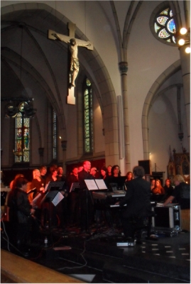 War in der Vorankündigung noch von einer Kulisse an den Hehner Grottenanlagen ausgegangen worden, mußte das Konzert in der Kirche stattfinden, was der Gestaltung eher noch förderlich war. Da viel Technik aufgebaut wurde, kam es hier und da zu Übersteuerungen - was bei Kirchenkonzerten durch Rückkopplung schnell passiert. Die einzelnen Gesangstücke des ersten Teils bestanden vorwiegend aus bekannten Gospelsongs, wo das Publikum schnell "mitging". Die Bänke in der Kirche waren gut gefüllt, es wurden noch Stühle zusätzlich aufgestellt. Während der Pause wurden schon Getränke angeboten - Glühwein war ganz klar der Renner.