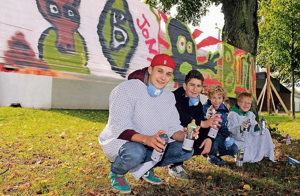 Nicht nur die internationalen Sprayer-Stars dürfen in Hehn ran. Auch der Nachwuchs kann sich betätigen: Unser Foto zeigt (v.l.) Jonas Dumke, Kai und Piet Schaath und Jakob Dumke. Foto: Isabella Raupold