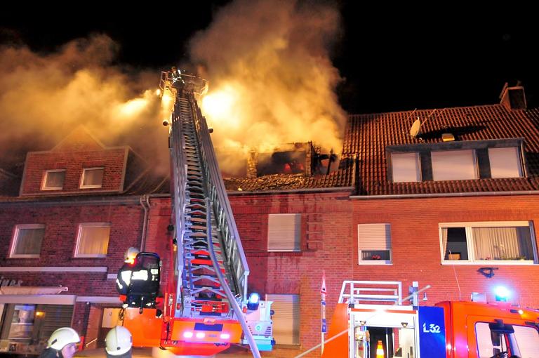 Um 23.52 ist die Feuerwehr alarmiert worden, als sie am Brandort Heiligenpesch ankam, war der Dachstuhl bereits im Vollbrand: "Flammen schlugen aus dem Fenster, das Dach war teilweise bereits eingestürzt", sagt Pressesprecher Frank Nießen. Die Bewohner des Hauses hatten sich bereits in Sicherheit bringen können. Aus den benachbarten Häusern mussten fünf Personen in Sicherheit gebracht werden.