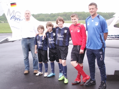 Die Trikots wurden in den Räumlichkeiten von MG flyers am Mönchengladbacher Flughafen überreicht. Den Kontakt hatte Fluglehrer Günter Schatten hergestellt, dessen Sohn bei den D1- Junioren der DJK aktiv ist. Doch bei der bloßen Übergabe des Trikotsatzes an die Mannschaft sollte es nicht bleiben, denn MG flyers bietet neben verschiedenen Schulungen als von der Bezirksregierung Düsseldorf genehmigtes Luftfahrtunternehmen auch Rundflüge an. Und eben vier solcher Rundflüge wurden an Ort und Stelle unter den Spielern verlost. So durften David Helmgens, Robin Hohnen, Oliver Peruz und Frederik Schubert im neuen Trikot und auch Trainer Torsten Müller direkt in die Luft gehen. Den Hehner Sportplatz am Rennbahnweg sowie Borussia-Park und Tagebau konnten die Auserwählten auf diese Weise einmal aus einer ganz anderen Perspektive erleben.