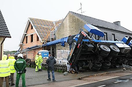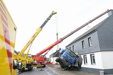 In Wolfsittard ist am Donnerstagmorgen gegen 10.50 Uhr ein mobiler Kran beim Entladen und Transportieren von Paletten in ein Wohnhaus gekippt. Dabei hat ein Ausleger des Krans ein Gerüst umgerissen. Bei dem Unfall wurden zwei Personen schwer verletzt. Eine Hauswand droht einzustürzen.
