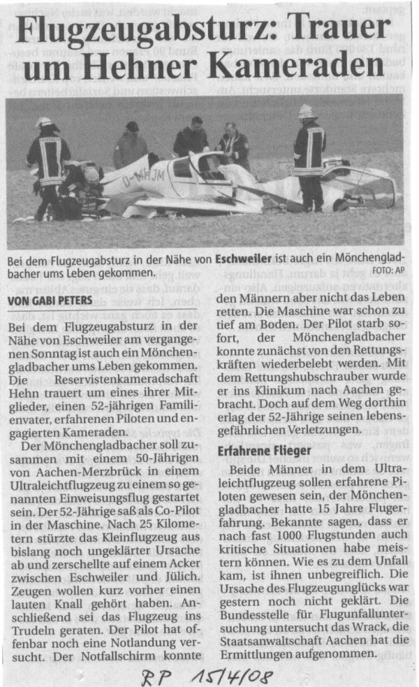 Aus bislang ungeklärter Ursache stürzte am Sonntag ein Ultraleichtflugzeug in der Nähe von Eschweiler bei Aachen ab. Die beiden Insassen haben das Unglück nicht überlebt. Der 50-Jährige Flugbegleiter starb noch vor Ort, der 52-Jährige Pilot erlag kurze Zeit später im Klinikum Aachen seinen schweren Verletzungen. Der Pilot stammt aus Mönchengladbach.