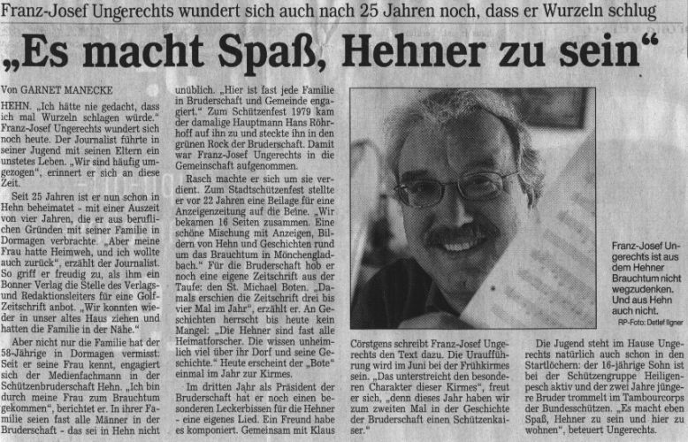 Es macht Spass, Hehner zu sein... schrieb Franz-Josef Ungerechts in der "Rheinischen Post" in der Ausgabe vom 16.04.04.