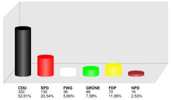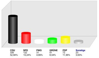 Ratswahl: CDU 52,84%, SPD 19,24%, FWG 4,89%, GRÜNE 8,04%, FDP 11,26%, Sonstige 3,23 %