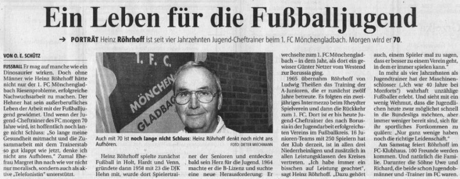 Die Rheinische Post berichtete am 27.09.2005 in einem Artikel über Heinz Röhrhoff, der seit vier Jahrzehnten Jugend-Cheftrainer beim 1. FC Mönchengladbach ist.