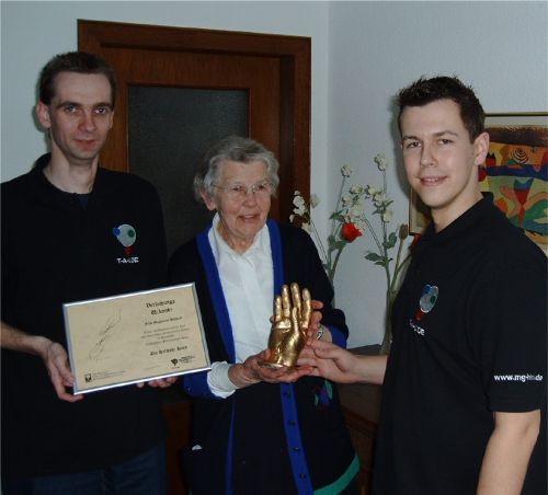Die Überraschung war gelungen. Der Verein für Öffentlichkeitsarbeit MG-Hehn, T-A-U, dankte am 21.03.2005 Frau Magdalene Sudhoff mit einer eigens für diesen Anlass geschaffenen Auszeichnung: „Die Helfende Hand“. Vorsitzender Ingo Lenzen überreichte eine Urkunde, Geschäftsführer Markus Eisenblätter eine selbst geformte Hand und Kassierer Klaus Cörstges einen Umschlag mit einer Spendensumme.
