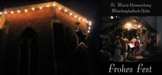 Sie zeigt das Motiv der Hehner Kapelle mit Weihnachtsbeleuchtung sowie die Hehner Krippe in der Pfarrkirche.Oben rechts steht "St-Mariä Heimsuchung Mönchengladbach-Hehn", unten "Frohes Fest".