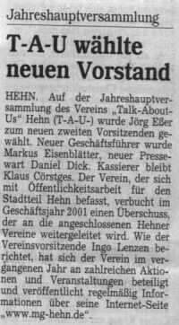 T-A-U wählte neuen Vorstand Details Veröffentlicht: Freitag, 22. Februar 2002 00:00 Geschrieben von Ingo Lenzen Zugriffe: 564 Pressemeldung Rheinische Post
