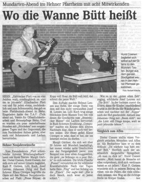 Wo die Wanne Bütt heißt Details Veröffentlicht: Freitag, 10. Januar 2003 00:00 Geschrieben von Ingo Lenzen Zugriffe: 627 Pressemeldung Rheinische Post Zurück Weiter