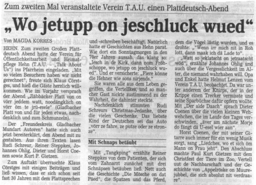 Wo jetupp on jeschluck wued Details Veröffentlicht: Freitag, 16. Januar 2004 00:00 Geschrieben von Ingo Lenzen Zugriffe: 639 Pressemeldung Rheinische Post
